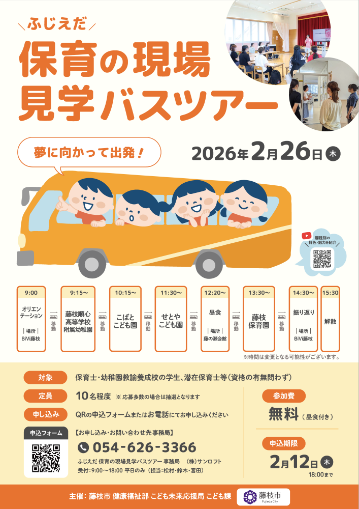 藤枝市では、施設種別の異なる園を1日で4園見学することができる「保育の現場見学バスツアー」を春休み期間中に実施します。